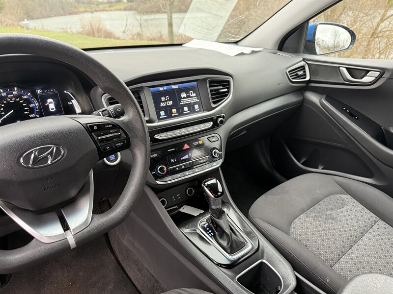 The exterior is finished in a striking blue, while the interior boasts black premium cloth upholstery, providing a comfortable and modern driving experience. Standard features include a 7-inch touchscreen display with Apple CarPlay and Android Auto integration, Bluetooth connectivity, a rearview camera, and a six-speaker audio system. Additionally, the IONIQ Hybrid Blue comes equipped with advanced safety features such as forward collision warning, lane keeping assist, and a driver attention monitor. This vehicle is in excellent overall condition, making it a reliable choice for eco-conscious drivers.